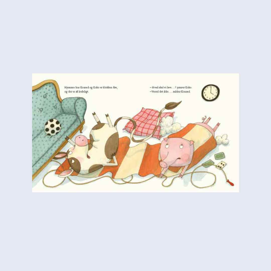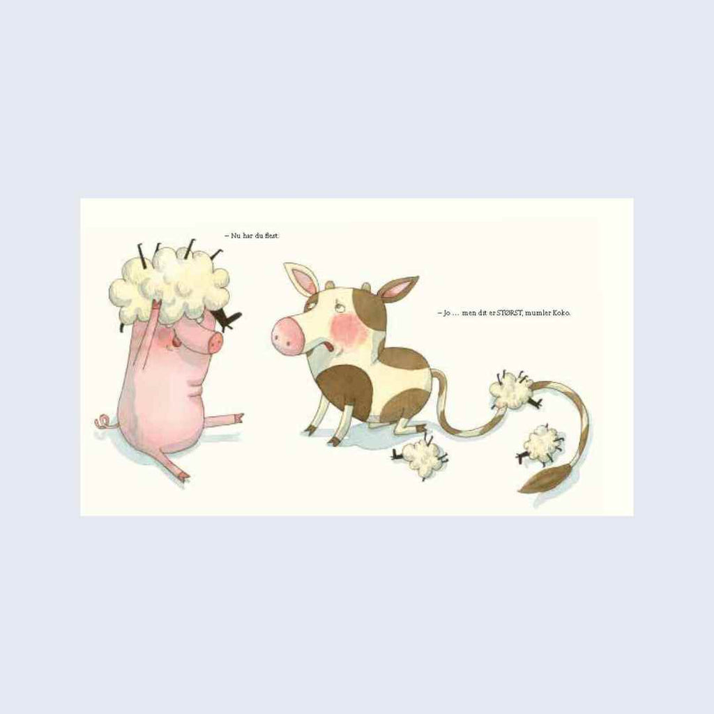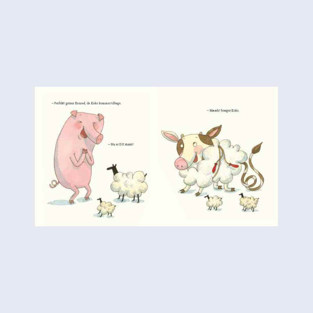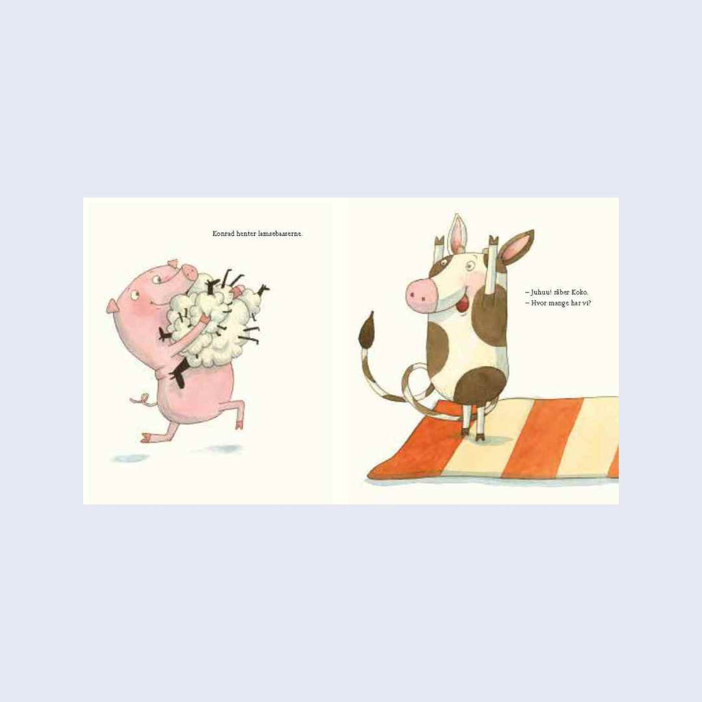 Konrad og Koko keder sig. ”Jeg har en idé! Vi kan lege bondegård,” råber Konrad og henter lamsebasserne. Et, to, tre, fire lam – Vi deler lige! Siger Konrad – To til mig og to til dig. Men et af lammene er MEGET større end de andre …