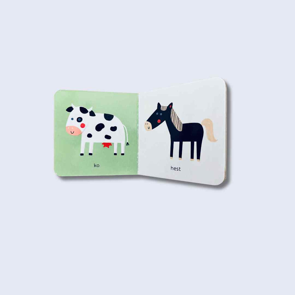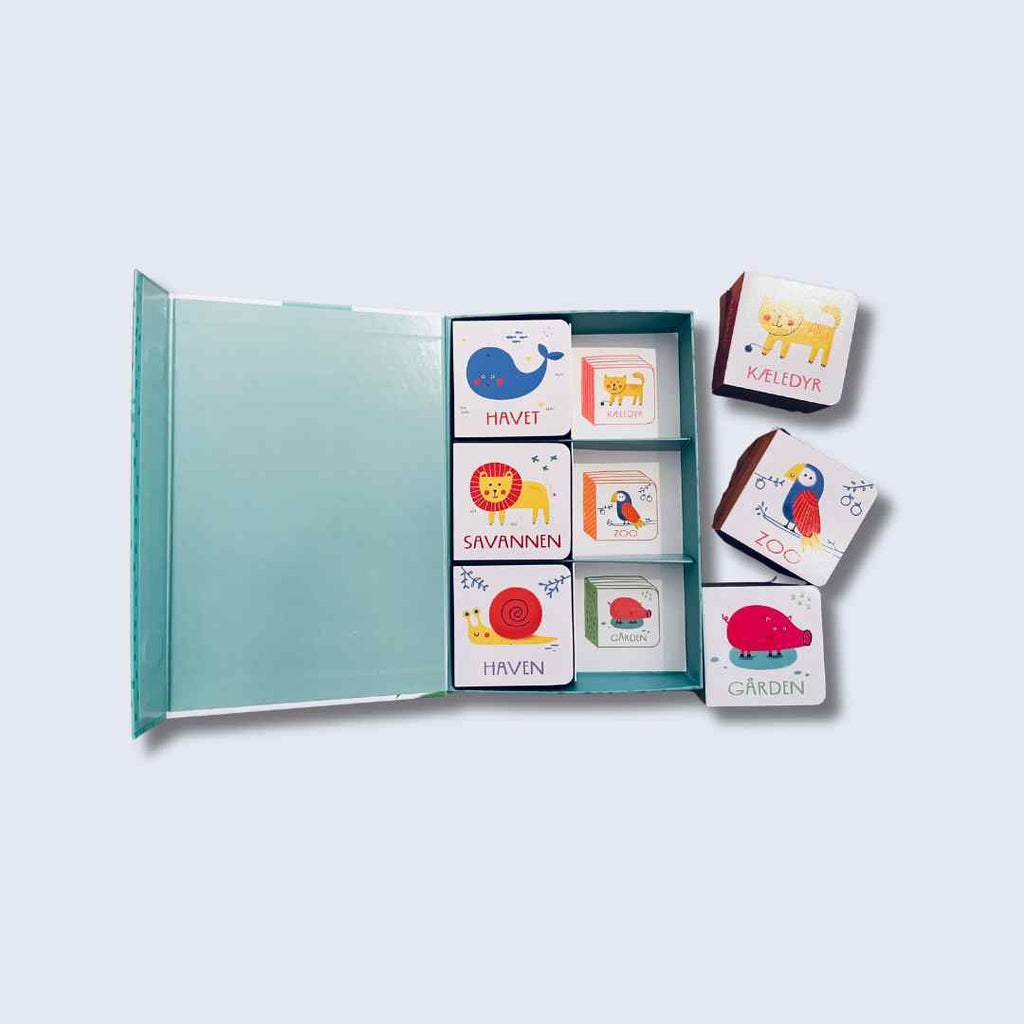 Bogboks med magnetlukning og seks små pegebøger i meget tykt pap, så de også kan bruges som byggeklodser. Perfekt boggave til de mindste.