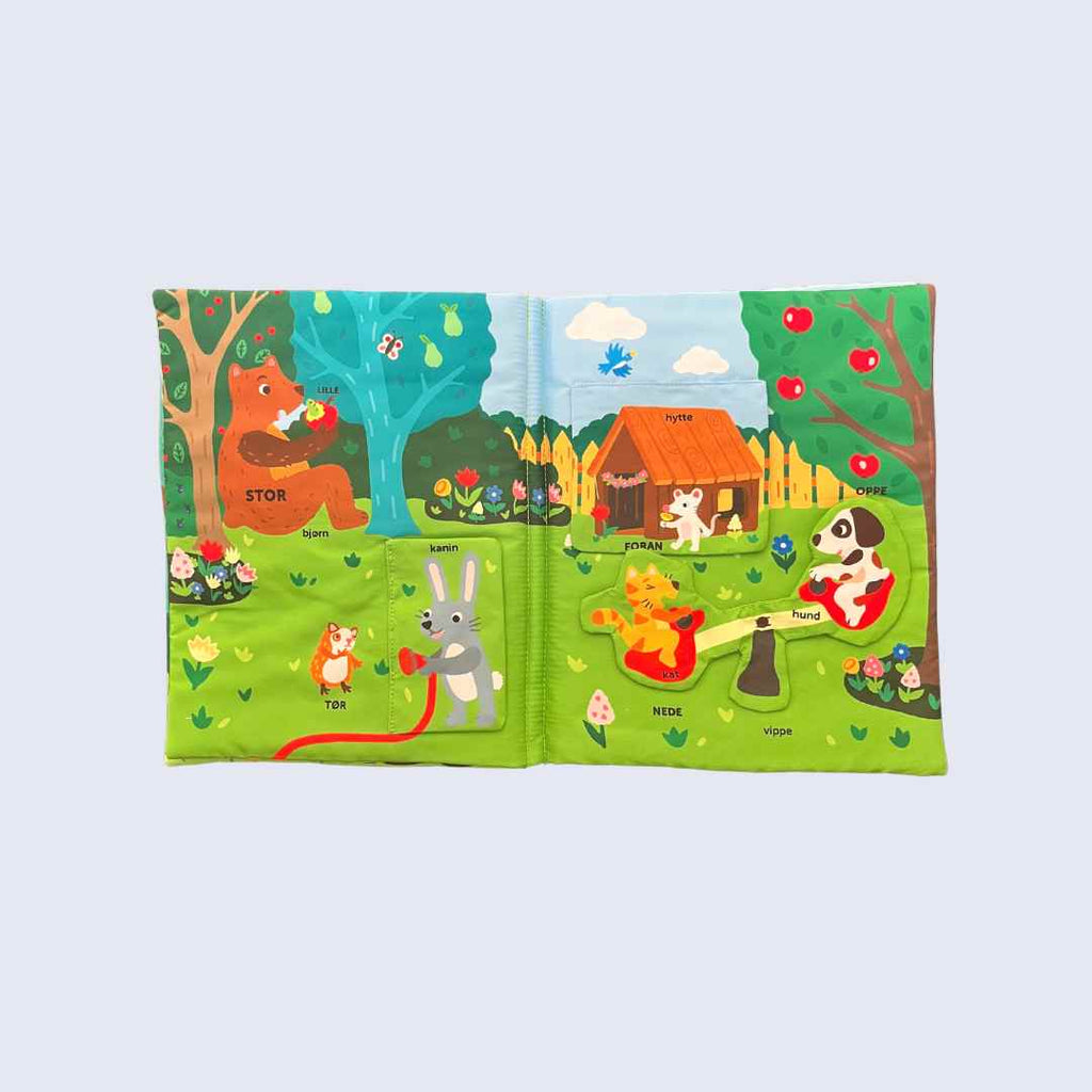 Denne bog er udviklet til at stimulere barnets sanser, motorik og sprogindlæring. Der er mange flapper og bevægelige elementer igennem bogen, og alle har den lækre knitre-effekt som børn elsker. Den store flap på forsiden har både klokke og knitre-effekt, perfekt til at fastholde barnets opmærksomhed. Der er masser at tale om og røre ved og både illustrationer og tekst har fokus på begrebslæring fx foran/bagved, oppe/nede. En smuk og lærerig bog til de mindste.